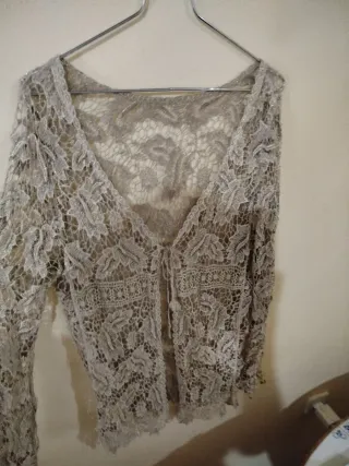 Jersey de encaje con detalles dorados y un diseño transparente. - Tejido delicado de encaje. - Acabado con hilos dorados. - Diseño abierto frontal.