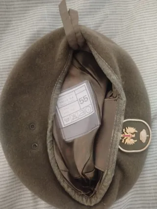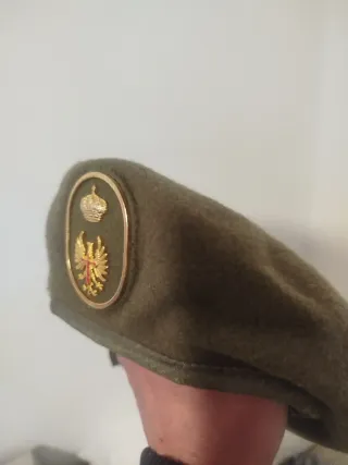 Boina de estilo militar con un distintivo metálico. - Escudo con águila y corona. - Color verde.