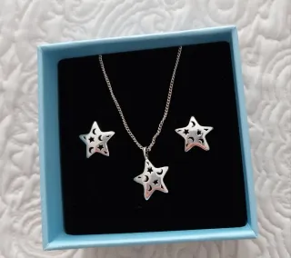 Conjunto de joyería con diseño de estrellas caladas, ideal para añadir un toque celestial a tu estilo. Incluye un colgante y un par de pendientes a juego. - Diseño de estrella con lunas y estrellas interiores. - Acabado plateado brillante.