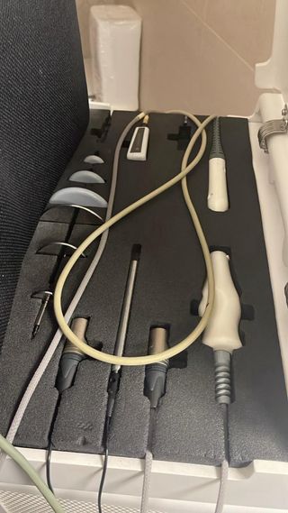 Equipo de radiofrecuencia Symmed. - Diseño moderno en color blanco y gris. - Incluye pantalla táctil para control. - Conexiones para aplicadores.