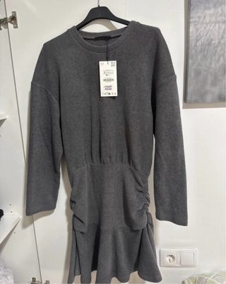 Vestido de punto gris de Zara con detalle fruncido. - Manga larga. - Cintura elástica. - Bajo con volantes.