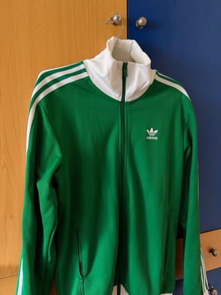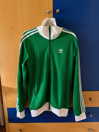 Chaqueta deportiva Adidas Originals con un diseño clásico y llamativo. - Color verde vibrante con detalles blancos. - Logo de Adidas bordado en el pecho. - Cremallera frontal completa. - Puños y cintura elásticos.