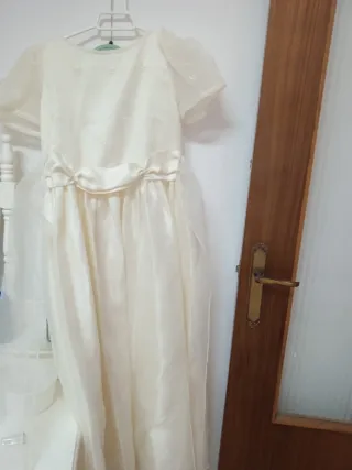 Traje de comunión para niña, elegante y delicado. - Diseño clásico en color blanco. - Tejido ligero y con detalles bordados. - Cintura adornada con un lazo satinado. - Mangas cortas abullonadas. Disponible para recoger en Torrent o Llíria