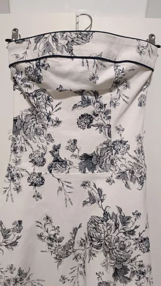 Elegante vestido blanco con estampado floral en tonos oscuros, ideal para eventos. - Diseño sin tirantes. - Estampado floral detallado. - Cremallera en la espalda.