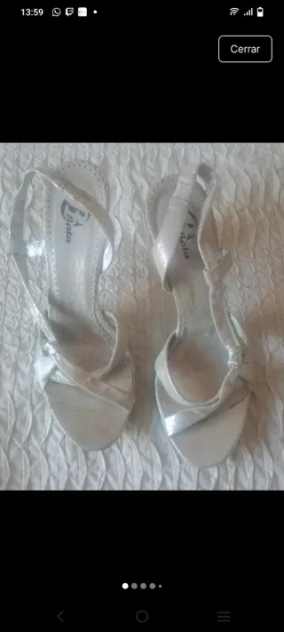 Elegantes sandalias de tacón con un acabado plateado brillante. - Diseño con tiras cruzadas en la parte delantera. - Correa ajustable en el tobillo para mayor comodidad. - Detalle de picado en el borde de la plantilla.
