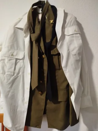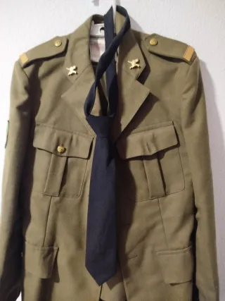 Conjunto de traje militar de color verde con una corbata negra. - Chaqueta con bolsillos frontales. - Hombreras con distintivos. - Corbata de tela. - Cierre de botones.