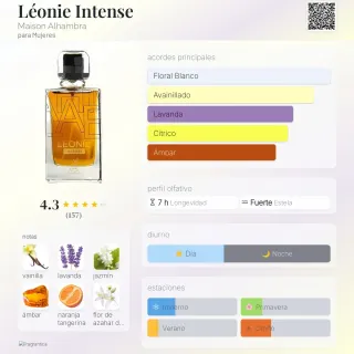 Perfume árabe LÉONIE INTENSE, precintado. - Eau de Parfum. - Natural Spray Vaporisateur. - Contenido: 100ml / 3.4 FL OZ. Léonie Intense de Maison Alhambra es una fragancia de la familia olfativa para Mujeres. Léonie Intense se lanzó en 2022. Notas de Salida son lavanda, naranja tangerina, grosellas negras y petit grain Notas de Corazón son lavanda, jazmín y flor de azahar del naranjo Notas de Fondo son vainilla de Madagascar, ámbar, almizcle y cedro.