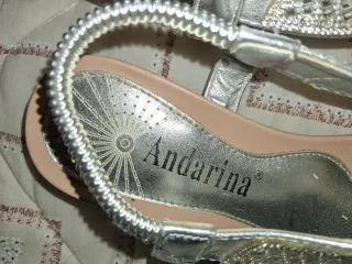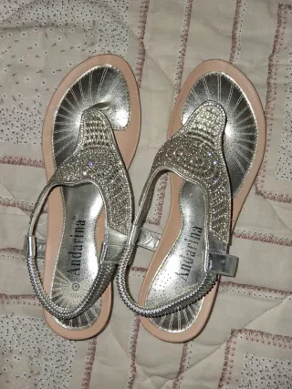 Elegantes sandalias plateadas de la marca Andarina, adornadas con pedrería. - Diseño tipo pala con tira. - Detalle de pedrería brillante en la pala. - Tira elástica en el talón para un mejor ajuste. - Suela cómoda con acabado metalizado.
