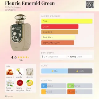 Este es el perfume Fleurie Emerald de Riiffs. - Eau de Parfum. - Vaporizador natural spray. - Contenido: 100 ml. - 80% Vol. - 3.4 FL.OZ. Fleurie Emerald Green de Riiffs Perfumes es una fragancia de la familia olfativa Oriental Vainilla para Mujeres. Esta fragrancia es nueva. Fleurie Emerald Green se lanzó en 2025. Las Notas de Salida son naranja sanguina, cáscara de limón y lavanda Notas de Corazón son flores blancas, regaliz, anís y canela Notas de Fondo son caramelo, vaina de vainilla y almizcle.