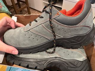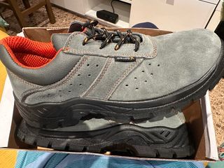 Zapatos de seguridad de la marca ORIOCX en talla 44. Diseñados para ofrecer protección y comodidad. - Exterior de ante gris. - Detalle interior en color naranja. - Cordones negros con detalles naranjas. - Suela de goma negra resistente. Puntera de acero, suela antideslizante y antiperforación. No envios.