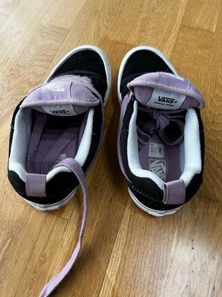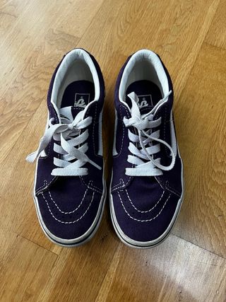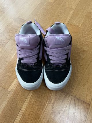 ¡Vendo zapatillas Vans Classic Slip-On en negro con detalles morados! Talla 34,5, en excelente estado, cómodas y originales con etiqueta visible. Ideales para uso diario o skate, ¡combina con todo!