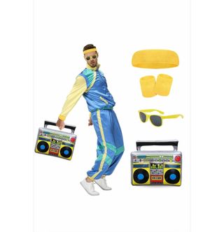 Disfraz Años 80 para Chico talla S con Complementos. Mirar la medidas de la última foto por si acaso. Ideal para fiestas de disfraces, fiestas temáticas, Carnaval etc. Incluye: - Chándal completo con chaqueta y pantalón en color azul, amarillo y verde. Tejido satinado brillante. - Cinta para el pelo y muñequeras amarillas en tejido de rizo. - Gafas de sol amarillas con lentes oscuras. - Radiocassete inflable. A estrenar.