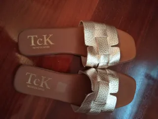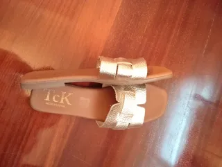 Sandalias planas de la marca TCK, fabricadas en España. Diseño moderno con tiras entrelazadas. - Tiras superiores en material dorado. - Suela cómoda. - Logo de la marca en la plantilla.