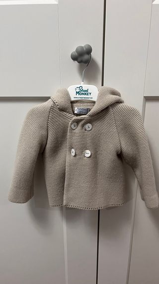 Chaqueta de punto con capucha y cierre de botones. - Diseño clásico y atemporal. - Tejido suave y confortable. - Ideal para cualquier ocasión. Da más talla ya que es punto bobo.