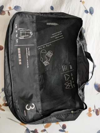 Conjunto de tres organizadores de maleta de la marca MINISO. Son perfectos para mantener tus pertenencias ordenadas durante tus viajes. - Organizador 1: Ideal para calcetines y objetos pequeños. - Organizador 2: Diseñado para ropa interior. - Organizador 3: Adecuado para prendas de vestir como chaquetas.
