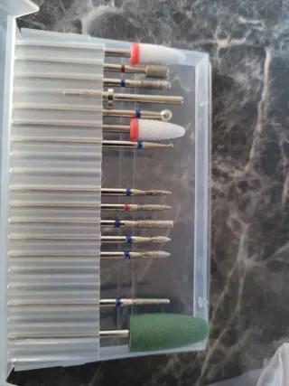Set de brocas para manicura y pedicura. Incluye una variedad de puntas para diferentes tratamientos. - Brocas de diamante y carburo. - Incluye broca de cerámica verde. - Estuche organizador transparente.