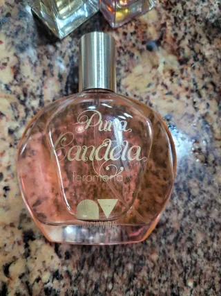 Este perfume tiene un cautivador aroma. - Botella de vidrio transparente. - Líquido de color naranja intenso. - Tapa negra.