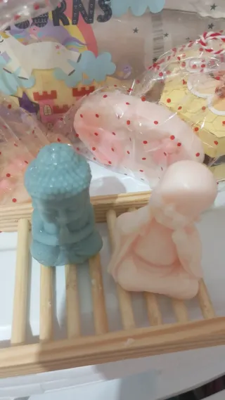 Set de jabones de glicerina con formas. - Jabón en forma de Buda en color azul. - Jabón en forma de Buda en color rosa. - Empaquetados individualmente.