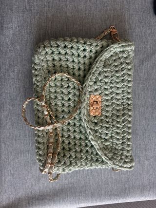 Bolso tejido en color verde con detalles metálicos dorados. - Cierre de solapa con broche. - Cadena metálica para llevar al hombro o cruzado. - Diseño moderno y versátil.