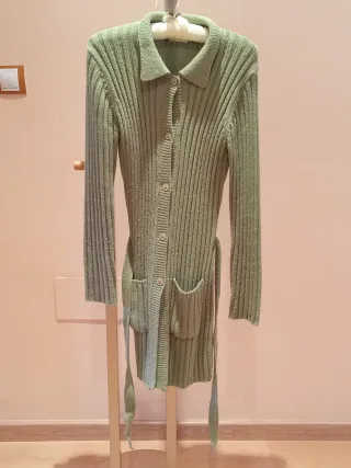 Cárdigan largo verde de punto con cinturón. - Diseño de canalé. - Cuello tipo polo. - Cierre de botones. - Dos bolsillos delanteros. - Cinturón - Talla:38/40. - Usado mucho.
