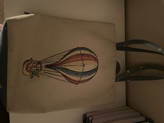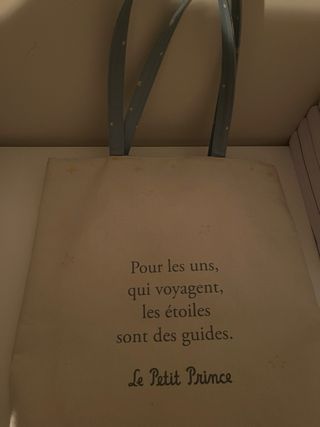 Bolso de tela con un encantador diseño del Principito en un globo aerostático. - Ilustración del Principito. - Diseño de globo aerostático. - Asas con estampado de estrellas. - Un pequeño bolsillito en el interior con un dibujo del zorro