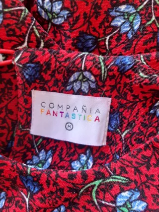 Vestido informal con un bonito estampado floral. - Diseño de manga larga. - Largo hasta la rodilla. - Estampado con flores azules sobre fondo rojo.