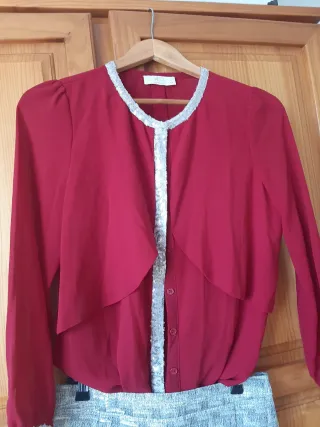 Elegante conjunto de dos piezas para ocasiones especiales. - Blusa roja con detalles plateados. - Falda con estampado geométrico plateado.