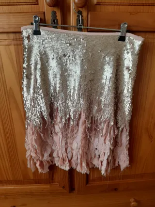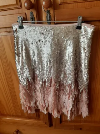 Falda con un diseño llamativo y festivo. - Parte superior cubierta de lentejuelas doradas. - Adorno de flecos en la parte inferior en tono rosa.