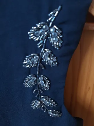 Elegante vestido de fiesta con un diseño brillante. - Cuerpo superior adornado con lentejuelas. - Falda larga de tul plisado. - Escote en V. - Manga corta.