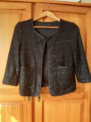 Elegante chaqueta corta con manga de tres cuartos. - Diseño texturizado con acabado brillante. - Ribeteado en contraste en el cuello y los bolsillos. - Bolsillos frontales de solapa.