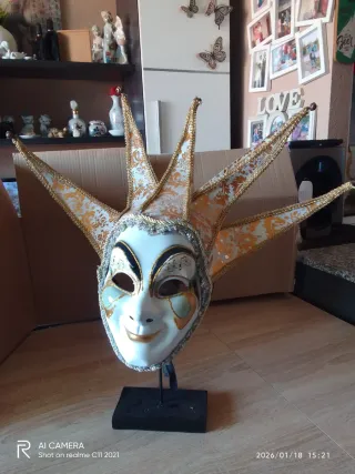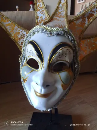 Máscara auténtica de carnaval de Venecia, con un diseño elaborado y detalles únicos.esta un poco despegado en una parte se puede ver en la último foto,se compro en 2002 en Venecia , precio negociable - Adornada con motivos dorados y blancos. - Diseño de bufón o arlequín.