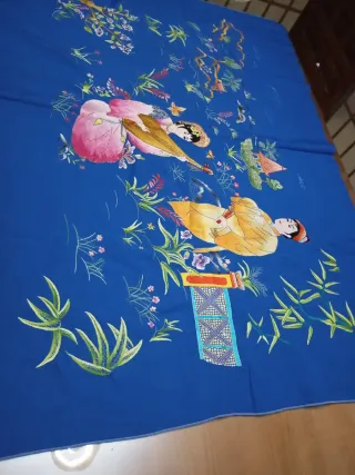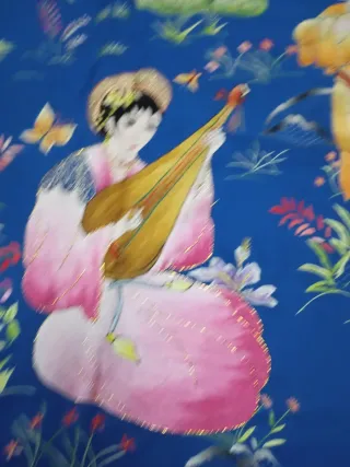 Preciosa seda con intrincados bordados hechos a mano, inspirados en el arte japones. - Diseño de figuras y motivos florales. - Colores vibrantes sobre fondo azul. - Material de seda de alta calidad. Mide 123 x 93