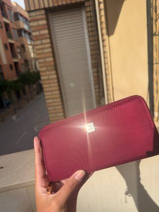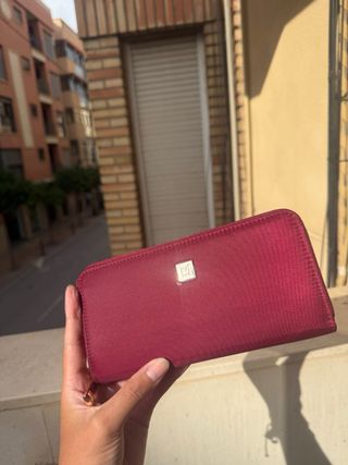Elegante cartera de mano en color burdeos. - Diseño moderno y funcional. - Acabado satinado. - Pequeño detalle metálico en la parte frontal.