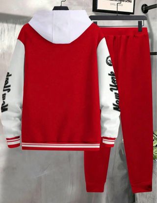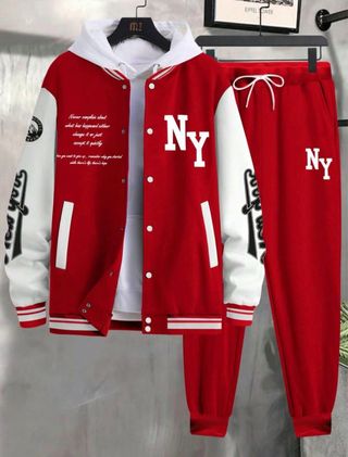 Conjunto deportivo de dos piezas con diseño inspirado en Nueva York. - Chaqueta estilo varsity con botones. - Pantalón de chándal con cordón. - Inscripción NY en la chaqueta y el pantalón. - Detalles de texto en la manga de la chaqueta.