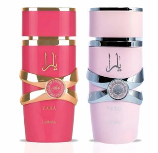 Set de dos fragancias Lattafa Yara y Yara Candy. - Incluye dos botellas de Eau de Parfum cada una de 100ml. - Diseño elegante con detalles dorados y plateados.