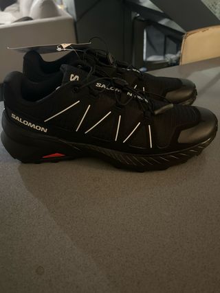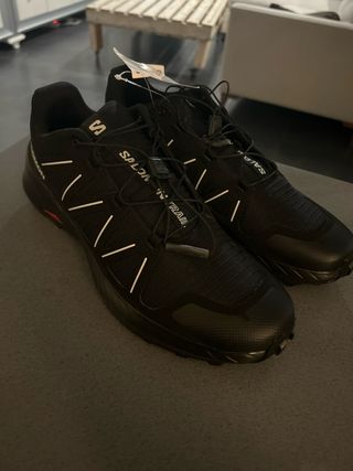 Zapatillas de trail running Salomon en color negro. Diseñadas para ofrecer comodidad y rendimiento en terrenos irregulares. - Cierre rápido con cordones. - Suela con buen agarre. - Detalle de líneas blancas. - Logo de Salomon en la lengüeta.