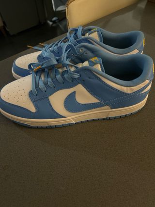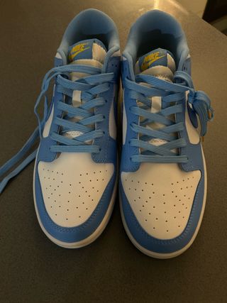 Zapatillas Nike Dunk Low con un diseño clásico y llamativo. - Combinación de colores azul y blanco. - Logo de Nike en la lengüeta.