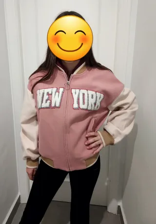 Bomber estilo universitario con diseño de New York. - Mangas de color beige. - Cuerpo principal en color rosa. - Puños y cuello con detalles. - Cierre de cremallera.