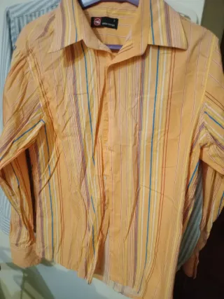Camisa de manga larga con un diseño de rayas verticales en tonos naranjas, amarillos, blancos y azules. El cuello es de solapa y tiene cierre de botones. - Diseño de rayas multicolor. - Cuello de solapa. - Cierre de botones.