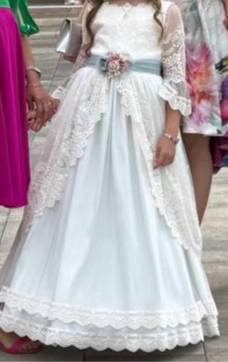 Vestido de comunión con un diseño elegante y delicado. - Cuerpo de encaje blanco con detalles. - Falda de tul en capas con sutiles adornos. - Lazos decorativos en la cintura , !!REGALO CANCAN Y TOCADO DEL PELO A JUEGO!!!
