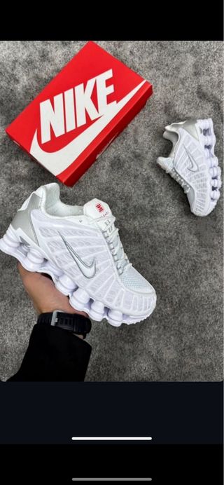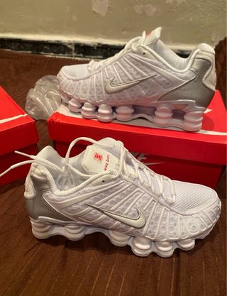 Zapatilla deportiva Nike Shox R4 en color blanco y plateado. Diseño moderno y cómodo.