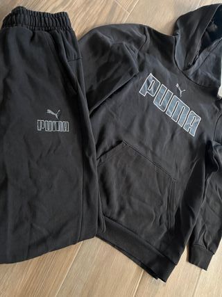 Conjunto original Puma en color negro. ✔️ Sudadera con capucha talla S ✔️ Pantalón talla XS ✔️ Logo frontal y lateral ✔️ Color negro combinable ✔️ Buen estado Ideal para gimnasio, diario o estilo deportivo. 📌 Las tallas son diferentes (S arriba y XS abajo), perfecto para persona delgada o que use pantalón más ajustado. 📦 Envíos disponibles 💬 Respondo rápido
