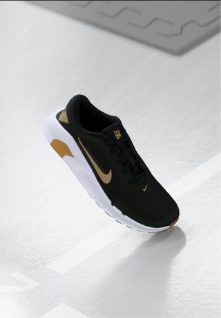 Zapatillas deportivas Nike con un diseño moderno y llamativo. - Combinación de colores negro y dorado. - Logotipo de Nike en el lateral.