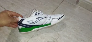 Zapatillas de fútbol sala de la marca DRIBLING. - Diseño en blanco con detalles en azul y verde. - Logo de la marca en naranja en la parte trasera.