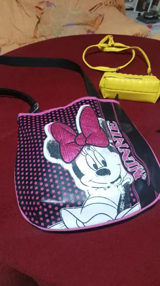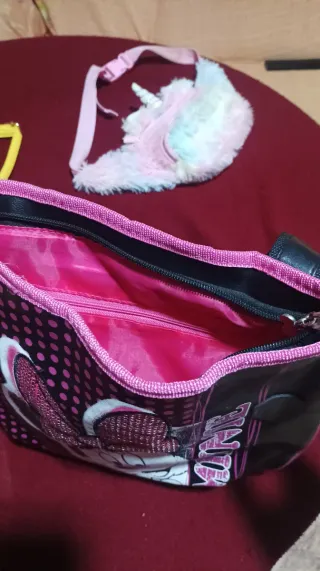 Bolso con diseño de Minnie Mouse. - Estampado de lunares rosas sobre fondo negro. - Lazo brillante de Minnie Mouse. - Detalle del nombre 'MINNIE' en el lateral. Bolsito más pequeño amarillo y riñonera de unicornio de regalo, para las más pequeñas de la casa ☺️
