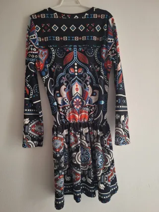 Vestido con un llamativo estampado de estilo étnico y mangas largas. El diseño presenta una cintura elástica que estiliza la figura. Talla única pero da desde una 36 a una 40 perfectamente. SOLO USADO 1 VEZ. - Diseño con estampado integral. - Mangas largas. - Cintura elástica. *La marca no es la que pone en el anuncio pero me obligan a poner una.