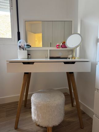 Elegante tocador de maquillaje con un diseño nordico. Perfecto para organizar tus productos de belleza. - Acabado en blanco. - Patas de madera para un toque natural. - Cajones para almacenamiento. REGALO TABURETE NO ENVIOS