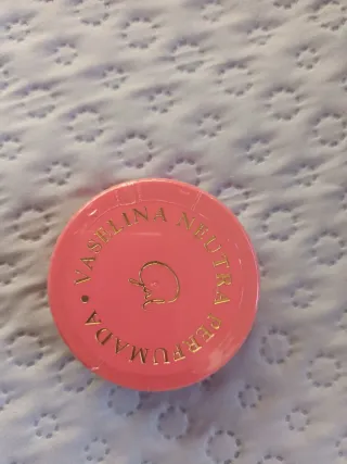 Tarro de vaselina neutra perfumada. - Tapa rosa con detalles dorados. - Contiene un logo circular en relieve.