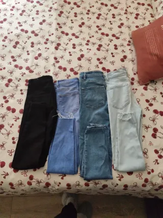 Lote de pantalones de las marcas Bershka y Stradivarius. - Pantalón negro. - Pantalón vaquero azul claro. - Pantalón vaquero azul medio. - Pantalón vaquero azul oscuro.