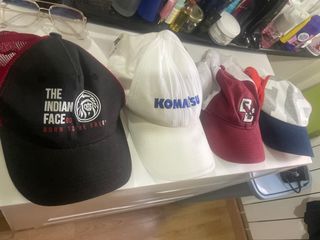 Conjunto de varias gorras con diferentes diseños y colores. - Gorra negra con estampado The Indian Face. - Gorra blanca con logo Komatsu. - Gorra de béisbol color burdeos. - Gorra con visera azul y estampado gris.